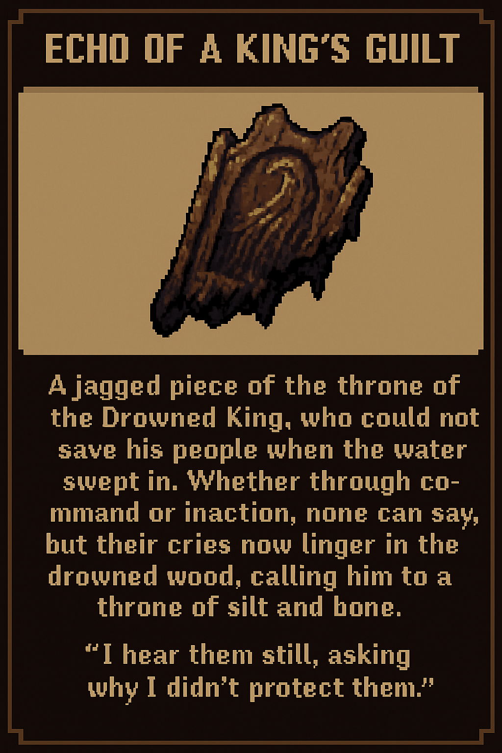 A jagged piece of the throne of the Drowned King, who could not save his people when the water swept in. Whether through command or inaction, none can say, but their cries now linger in the drowned wood, calling him to a throne of silt and bone.