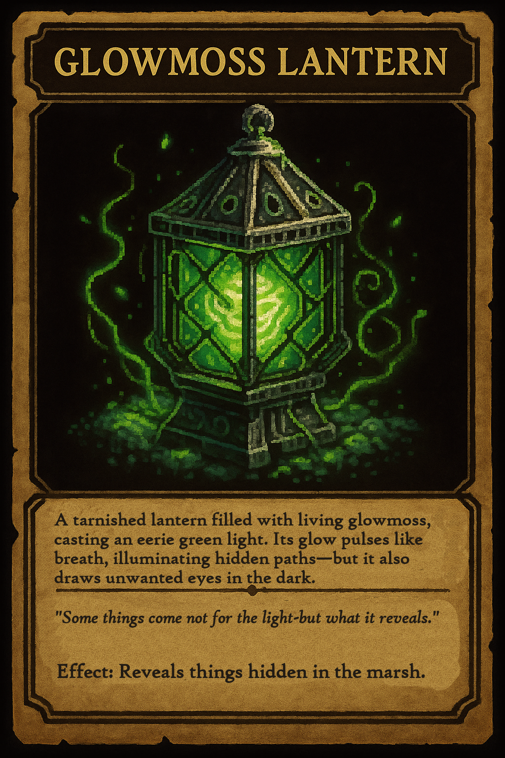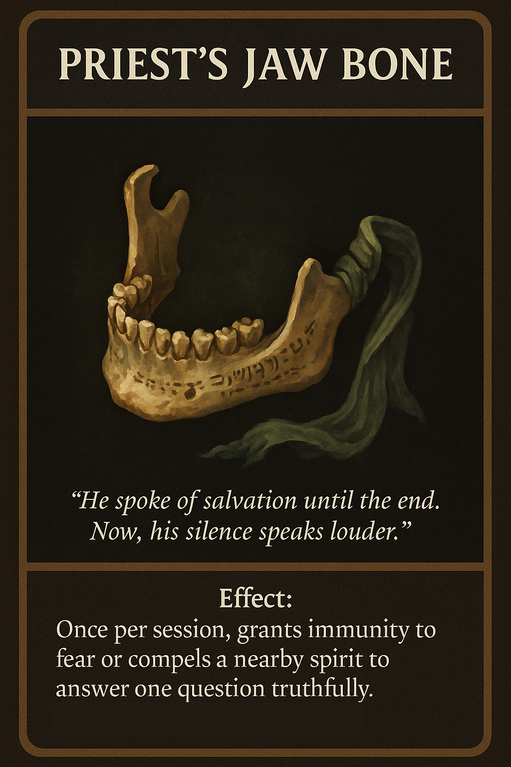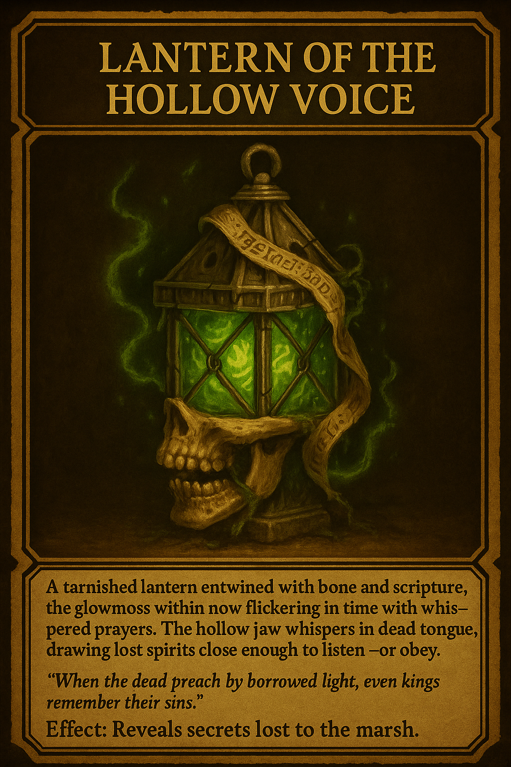 A tarnished lantern entwined with bone and scripture, the Glowmoss within now flickering in time with whispered prayers. The hollow jaw whispers in a dead tongue, drawing lost spirits close enough to listen—or obey.