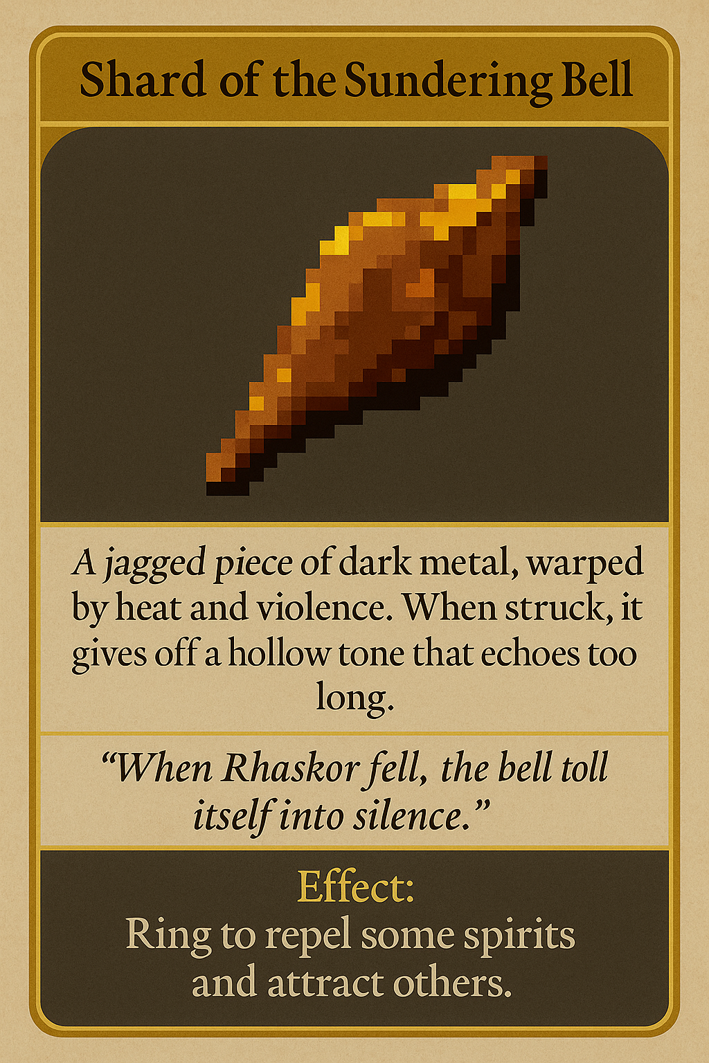 Shard of the Sundering Bell A jagged piece of dark metal, warped by heat and violence. When struck, it gives off a hollow tone that echoes too long."When Rhaskor fell, the bell tolled itself into silence."Effect: Ring to repel some spirits and attract others. ^shard-of-the-sundering-bell