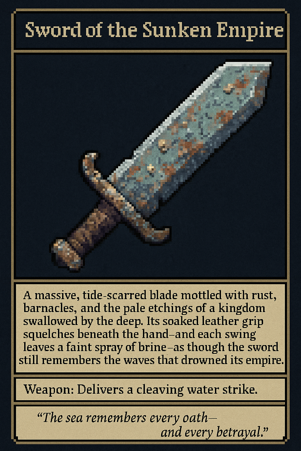 A massive, tide-scarred blade mottled with rust, barnacles, and the pale etchings of a kingdom swallowed by the deep. Its soaked leather grip squelches beneath the hand-and each swing leaves a faint spray of brine-as though the sword still remembers the waves that drowned its empire.