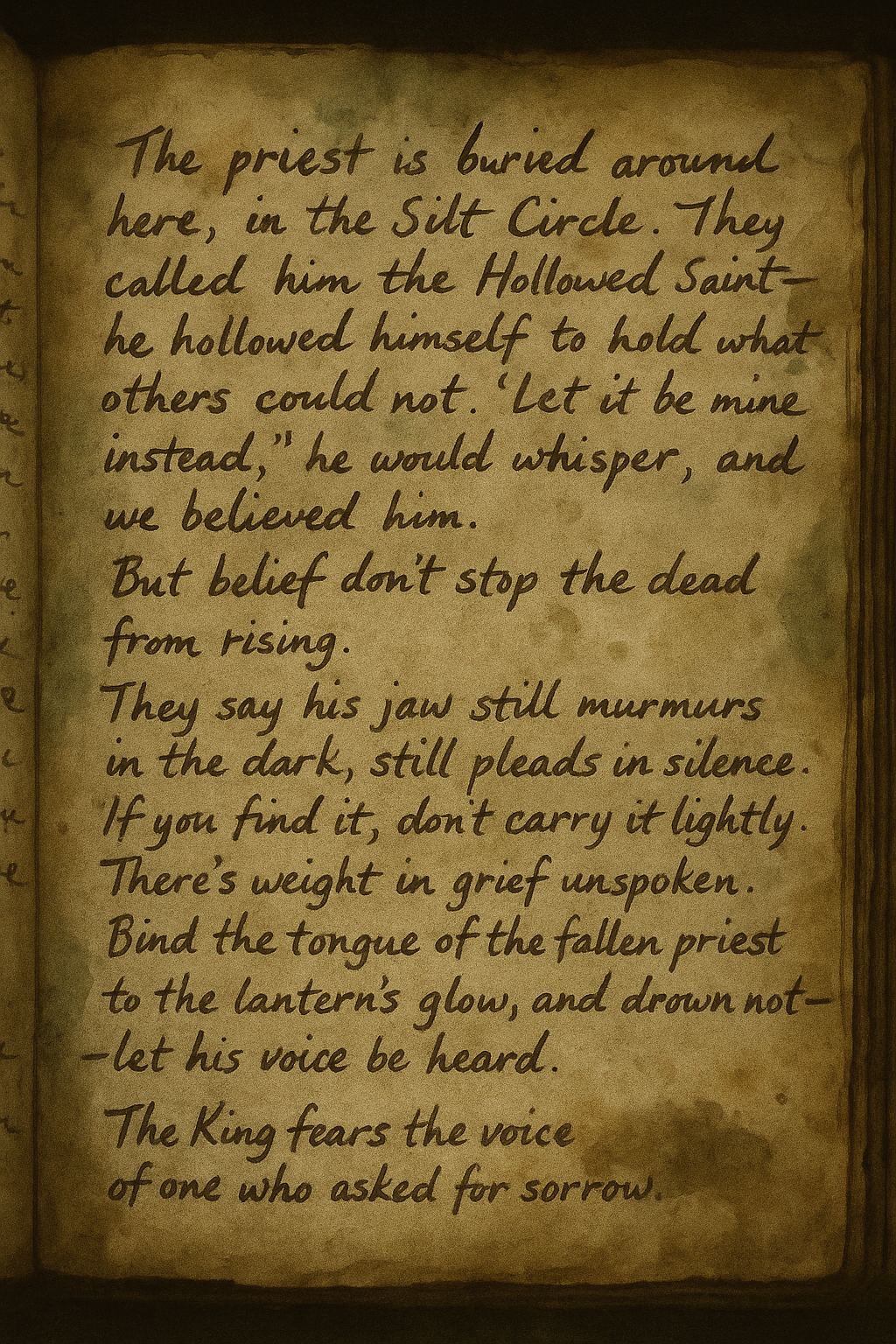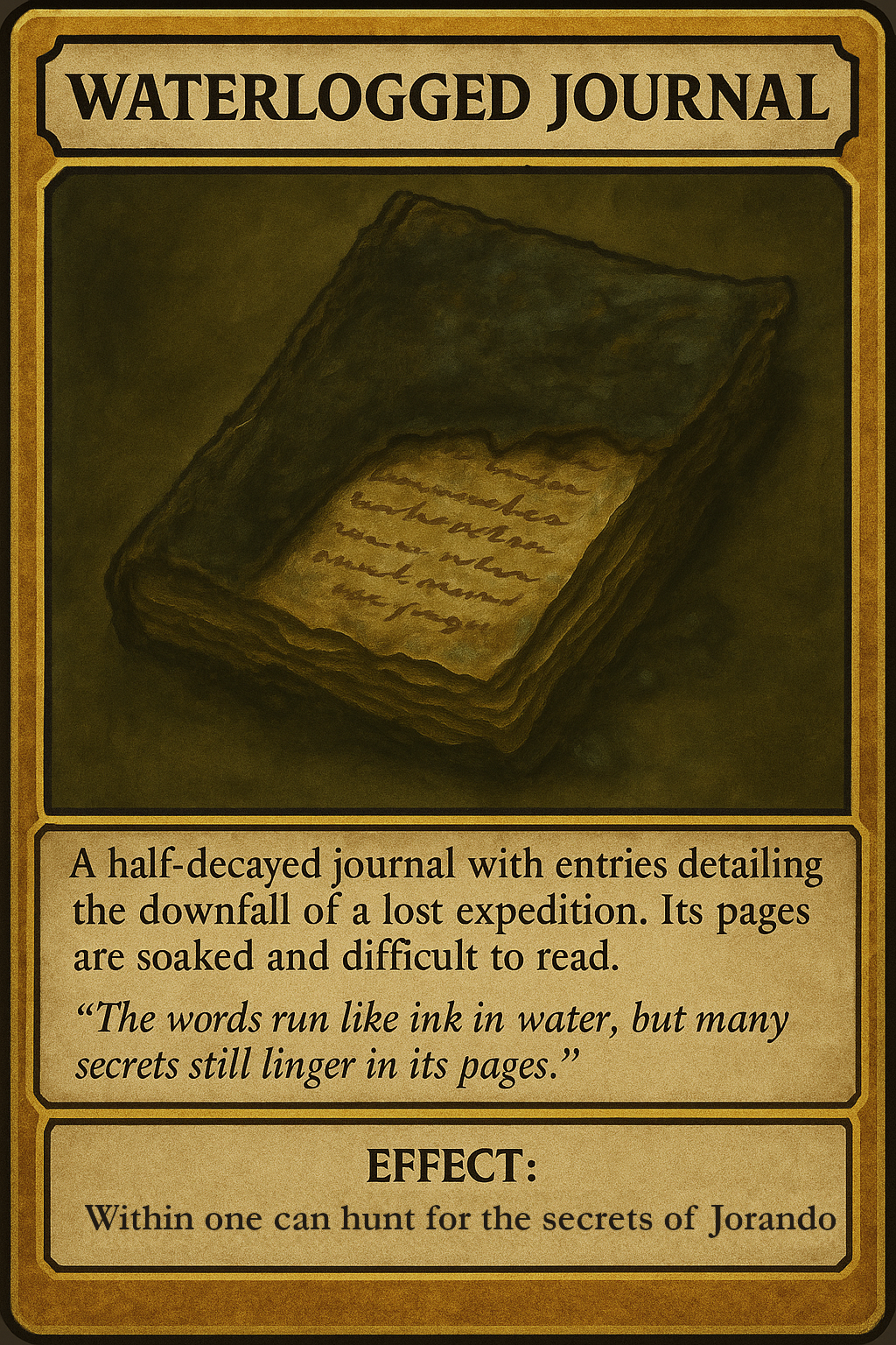A half-decayed journal with entries detailing the downfall of a lost expedition. Its pages are soaked and difficult to read.